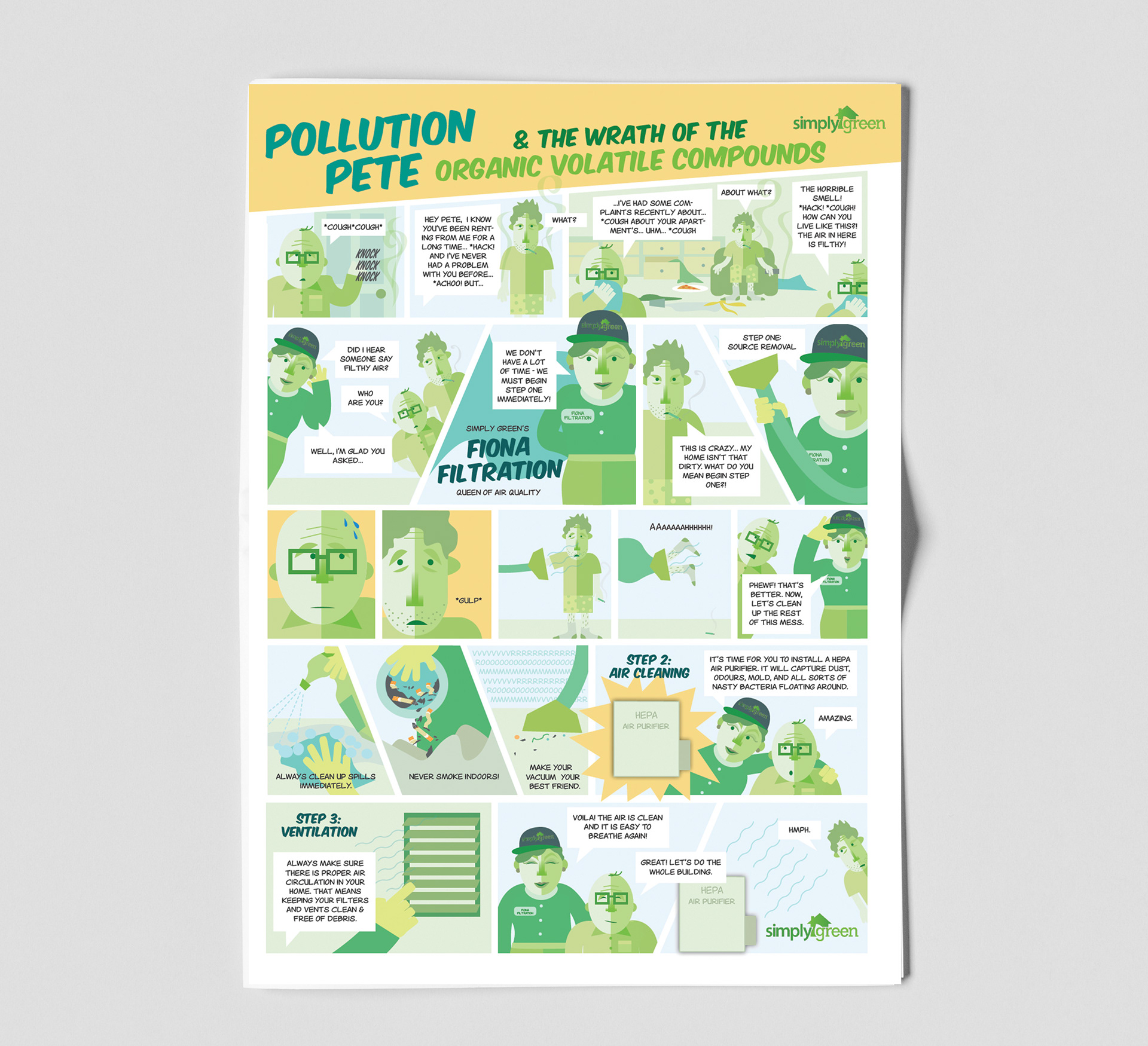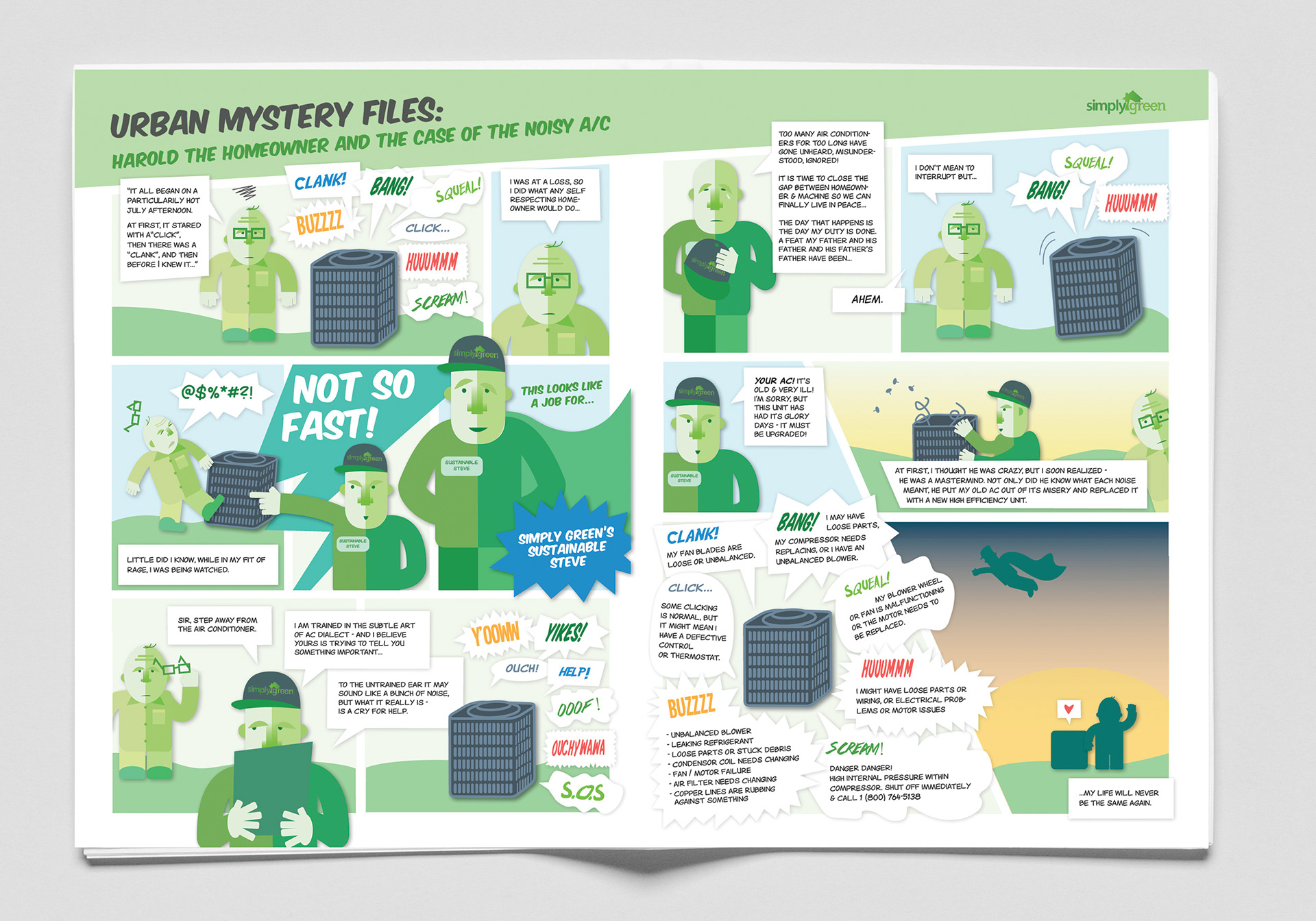 I wrote and illustrated these comics as part of a business-wide biweekly newsletter for SimplyGreen Home Services. Each comic educated viewers on a particular house-hold problem and a piece of equipment that the company sold.