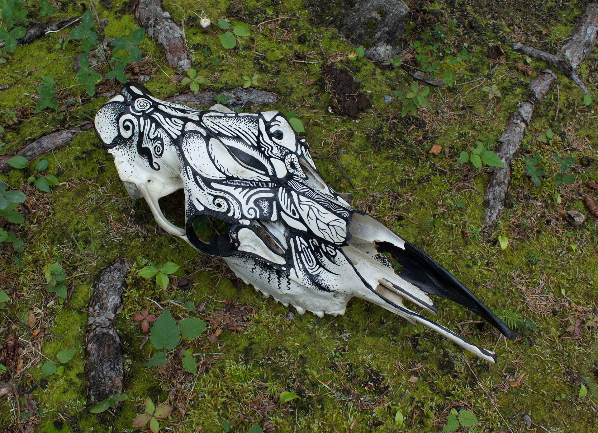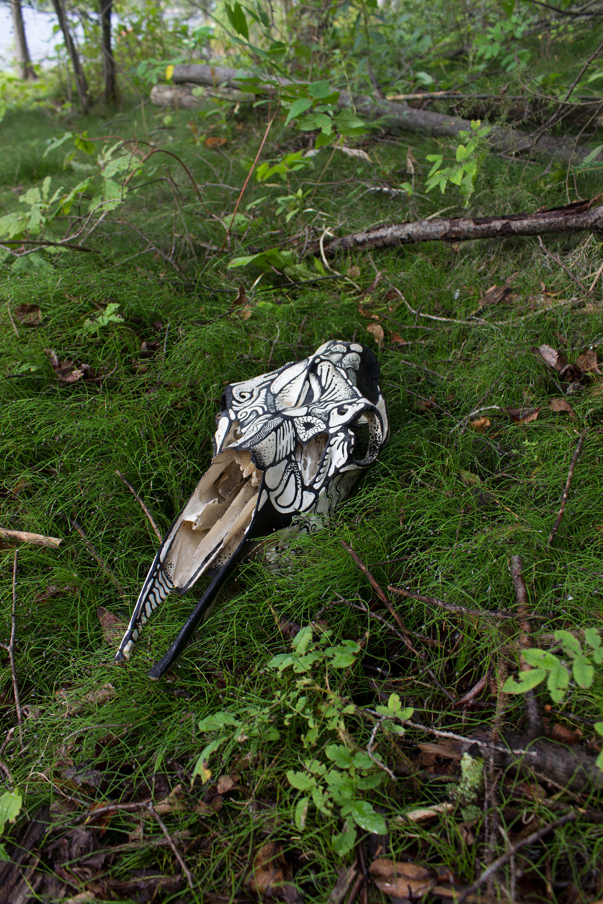 For this piece, I used a moose skull as my canvas. I wanted to take a part of the animal that is sometimes discarded, and give it new life and meaning.